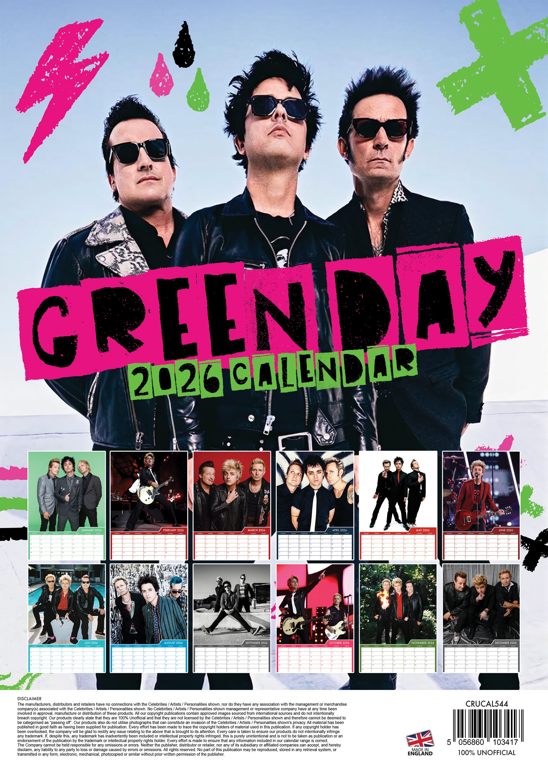 Rock your wall with the Green Day 2026 A3 Calendar! Featuring the legendary punk icons in all their glory, this oversized calendar keeps you organised in style. Perfect for fans who want to countdown the days with attitude, each month showcases stunning imagery that'll make every date feel like a sold-out show. Whether you're planning gigs, tours, or just living day-to-day with punk spirit, this calendar brings the energy. A3 size means maximum impact—ideal for bedrooms, studios, or anywhere that needs a dose of Green Day magic.