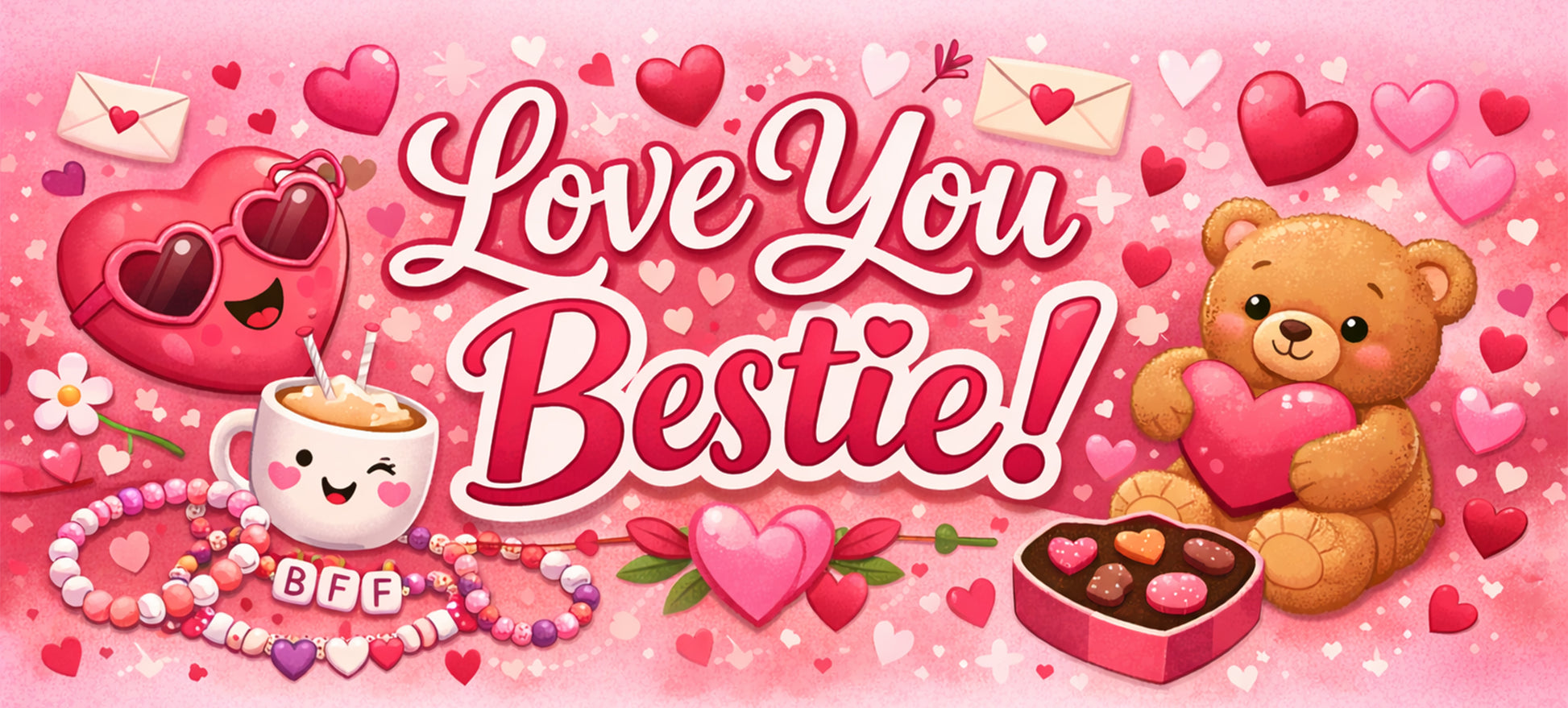 - 💖 SWEET BESTIE MESSAGE Features the cheerful phrase “Love You Bestie!” with cute heart-filled artwork — a fun and loving way to celebrate friendship.