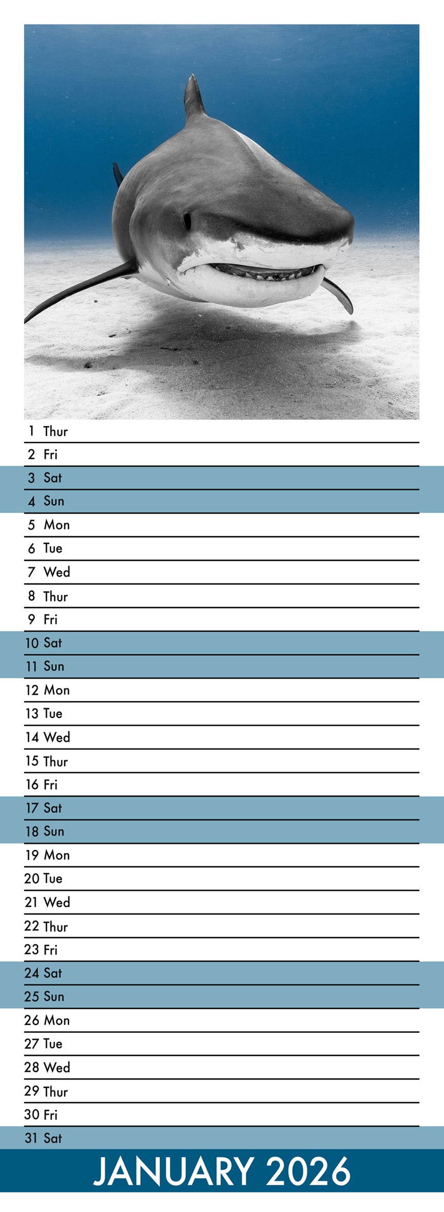 Gear up for the year ahead with the 2026 Sharks Calendar! Featuring twelve months of stunning shark photography to swoon over, this wall calendar is not just a feast for the eyes - it comes complete with a working grid for tracking your schedule. Make your year a shark-tastic one!